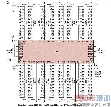 ![]() 图1:峰值功率跟踪降压充电器最大限度地提高了效率 问:Linear提供了哪些独特的解决方案来解决以上设计挑战? 答:为了满足LED驱动以及太阳能电池板电池充电器的设计需要,凌力尔特提供了各种各样的产品。LT3595、LT3518和LT3755便是其中一些产品。 此类产品和LED驱动器IC的一个实例是凌力尔特的LT3595降压模式LED驱动器,它具有16个单独的通道,每个通道能够从高达45V的输入来驱动一个由多达10个50mA LED所组成的LED串。每个通道可用于驱动10个串联LED以提供局部调光。于是,每个LT3595都能够驱动多达160个50mA白光LED。一台46英寸LCD TV将需要为每部HDTV配用约10个LT3595。它的16个通道均可以独立控制,并具有一个能够提供高达5000:1 PWM调光比的单独PWM输入。 每个通道只需要一个纤巧的片式电感器和一个甚至更加小巧的陶瓷输出电容器。所需的其他元件仅为单个输入电容器和电流设定电阻器 (图2)。所有16个通道的箝位二极管、电源开关和具补偿功能的控制逻辑电路都被压缩在LT3595的相对较小56引脚、5mm x 9mm QFN封装之内。