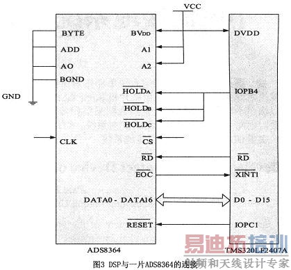 TMS320LF4207A本身虽然自带A/D转换器,但其转换精度只有10位,且转换速度也不高(500ns)。为了实现更高的速度和精度,选择了扩展ADS8364芯片。ADS8364是一种高速、低功耗、双16b A/D转换器,有6个模拟量输入通道。可用BVDD独立供电。它有6个完全相同的采样保持电路,分成A、B、C3组,每一组都由1个HOLD引脚控制。ADS8364可以从外部引入最大5MHz的时钟频率,此时采样时间是0.8 μ s,转换时间只有3.2 μ s,A/D的最大采样率达到250K,要达到此值,可在下一次转换开始时读取上一次的转换结果。此A/D完全可以满足本装置的采样要求。AD芯片与DSP的连接如图3所示。