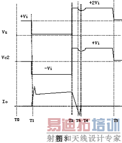 3)在T2时刻,功率管S关断,变压器中的漏感与磁化储能给功率管等寄生分布电容充电,(B点电压)VS最终上升到2VI,A点电位也从- VI 上升为+VI ,若此时B点电位进一步上升,二极管D3将正向偏置导通,功率管S漏源间的电压VS通过电容C2和二极管D3得到有效箝位。