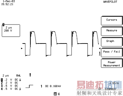 利用示波器测试其在输入220VAC、输出20V/8A条件下,功率开关管漏源极电压波形如下图4所示,测试结果表明过压尖峰得到了有效抑制,实现了无源无损箝位的目的。