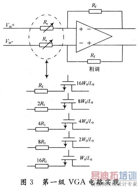 当运算放大器的增益足够大时,闭环VGA的增益等于两个电阻的比值:Gain=-RF/Rs,改变电阻可以实现增益的变化。粗调的阻值变化很大,改变反馈Rf,会影响粗调输出节点的极点;电阻Rs可变,它对前级将形成变化的负载效应。选择改变Rs,在前级增加缓冲电路进行隔离。