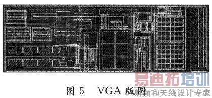 图5是用SMIC 0.18μm CMOS工艺实现的VGA版图,芯片面积为:510μm×160μm,整个版图包括VGA核心部分,直流偏移消除模块,和CMOS源极跟随缓冲电路,恒定Gm的偏置电路。