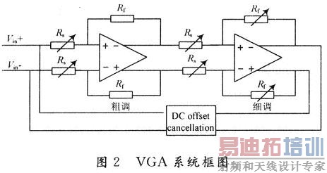 为了达到要求的增益控制范围和步长,使用两个级联的VGA。第一个部分的VGA实现6 dB步长的增益控制,另一个部分实现精准的O.5 dB步长。因此整个VGA实现了粗调和细调(见图2)。