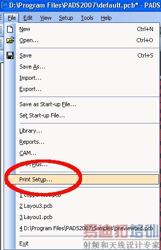 图中只有一个“Print Steup..”,只能进去设置一下打印的纸张大小等等。请问,我的“Print”打印菜单怎么没有呢?是我软件安装的问题还是PADS2007就没有这一项?(不可能没有打印菜单的吧……)