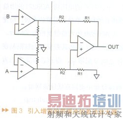 电路中差动放大器的噪声仍然存在,但折算到输入端时噪声要除以第一级的增益。由于可以使用阻值非常小的电阻器,因此第一级的噪声可以做得非常低,而且不影响输入阻抗。这种结构的另外一个好处是在高增益时有较宽的带宽。原因是电压反馈放大器具有一定的增益带宽乘积,通过把增益分散到两级放大器,可使每一级的增益比较低,降低差动放大器级的增益,从而不会被增益带宽乘积所限制。然而还有一个没解决的问题就是共模抑制比。图3的电路将共模信号和差分信号都放大了,而所有的共模抑制都在差分放大级实现,因此,很容易超过第一级的输入电压范围。