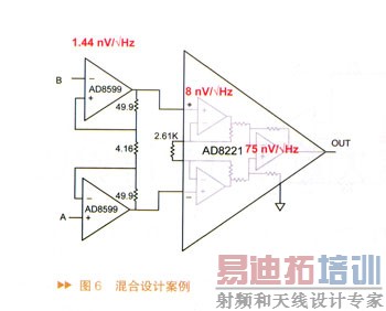 噪声是仪表放大器的一个重要指标,现在很多运放都具有非常低的噪声系数,如果要求更低的噪声,则可以采用分立设计方法构建仪表放大器。然而这需要花费很大的精力来设计、布局和调试,而得到的共模抑制比又低于单芯片仪表放大器。图6所示的混合设计节省了设计时间和电路板空间,同时得到了与单芯片仪表放大器同样好的共模抑制性能。
