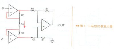 对于仪表放大器的第一级,每个运算放大器都要保持其两个电压输入端的电压相同。图4中R4两端的差分电压应当和两个输入端的电压相同,这个电压产生一个电流,流过电阻器R3并产生了放大器的增益。