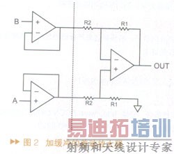 差动放大器的优点是结构简单,最主要的缺点是输入阻抗很低。由于增益由R1/R2决定,因此需要在高增益和高输入阻抗间做出折中。此外,将信号分压变小后再进行放大(如同相通路),并不是获得良好噪声性能的方法。对于反相通路而言,加入了额外的电阻,并且反相放大电路的噪声增益总比信号增益高。提高输入阻抗就要求增加电阻的数值,这样将会产生更多的噪声。最后,共模抑制比也受到限制。为了改善这些缺点,第一步是对输入进行缓冲,这样就解决了输入阻抗的问题,如图2所示。