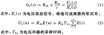 APFC控制原理如下:Boost电路的输出电压,即直流母线电压V0经传感器采样、隔离后送入DSP的ADCIN2口,并转换为数字信号,与参考数字电压Vref比较,其偏差值送入电压控制器Gv,通过纠偏控制使V0与Vref相等,Gv采用数字PI控制,有: