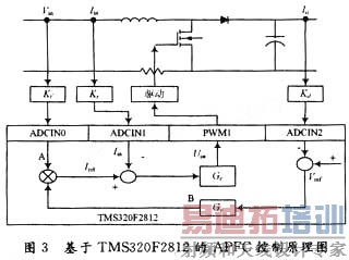 图3给出基于DSP-TMS320F2812的APFC控制原理图。TMS320F2812芯片是TI公司推出的32位定点数字信号处理器,具有强大的控制和信号处理能力,是用于数字电力电子变换与控制的高性价比DSP芯片。