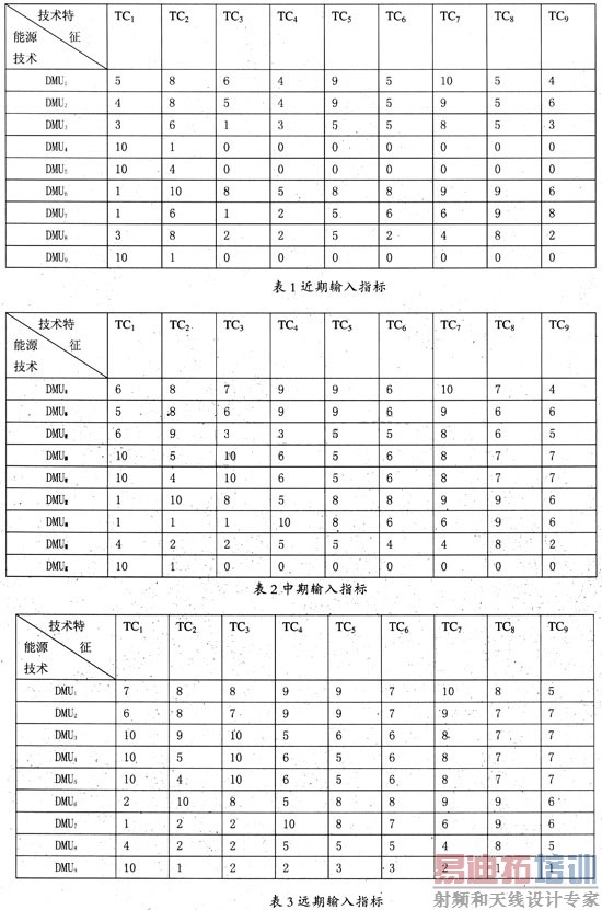 本文以一次电池DMU1,二次电池DMU2,燃料电池DMU3,,超微型然烧机DMU4微型燃气轮机DMU5,电化学电容器DMU6,人力发电DMU7,太阳能发电DMU8,核能同位素DMU9沩分析对象。每种技术在不同时期的输入指标如表格1、2、3所示。