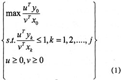 DEA的第一个模型是1978年由Charnes等人给出的。假设有j个决策单元(DecisionMakingUnits,简记DMU)。每个DMU都有m种输入和s种输出,其输入和输出向量为xk=(x1k,x2k,…,xmk)T,yk=(y1k,y2k,…,ysk)T。xik=DMU-k对第i种输入输入量,yrk=DMU-j对第r种输出的产出量(k=1,2,…,j;i=1,2,…,m;r=1,2,…,s)。为了方便,记DMU-k0对应的输入、输出数据分别为x0=xj0,y0=yj0,1≤k0≤j。评价DMU-k0的相对有效性的DEA模型(C2R)为: