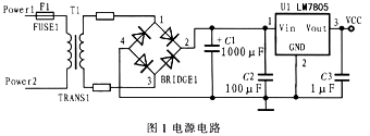 硬件设计采用Altera公司的CPLD EPM7128SLC84-6,简化了外围电路,稳定性和可靠性高,成本低。220 V、50 Hz工频电源经变压器、电桥整流后通过三端稳压器,提供工作电压,其电源电路如图1所示。