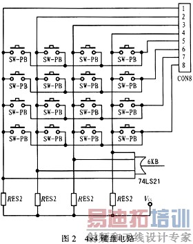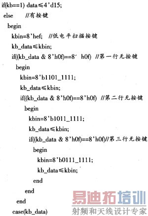 CPLD检测到kb下降沿时,表示有键按下时,为防止按键抖动,延时一段时间再检测,若确有键按下,CPLD采用低电平逐行扫描,待找到按键时,根据扫捕得到的数值,确定按键值。对于无效按键,设按键值为"15"。输入信号kb的下降沿触发对键值的读取,可保证对于每一次按键,仅作一次处理。主要程序如下: