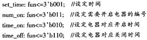 程序初始化时为设定时间、开启电器编号、电器开启时间、电器关闭时间4个功能键设置对应按键值。定义功能标志寄存器fun,并使用格雷码标志各个功能,相邻两个功能的编码仅有一位不同,可避免状态跳变,比目前常用的独热码节省CPLD逻辑单元。由于本设计中寄存器fun只有5个状态,选用3位格雷码,并对编码方式进行改进。根据上一步得到的按键值判断具体要实现哪个功能,并依此设置fun的值,如下所示: