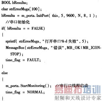 发射机控制台要完成对雷达显示控制指令的响应,还要完成对发射机的控制,因此需要开启3个串行口线程,线程的开启方法相同,在InitPort()函数设置端口号5,波特率为9 600 bit/s,数据位数为8位,无奇偶校验位,1位停止位。通过函数StartMonitoring()打开线程。程序如下: