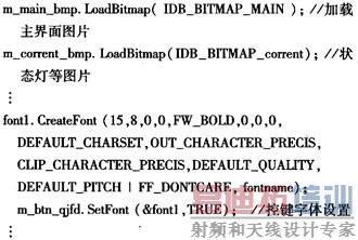 为使显示界面更为友好,根据实物按比例先绘制出主界面图形和其他相关图形,再通过VC菜单插入资源,将这些图片添加至项目中。程序启动时,调用初始化程序OnInitialUpdate()加载图片,再对显示控制界面中各控键的字体进行设置。程序如下: