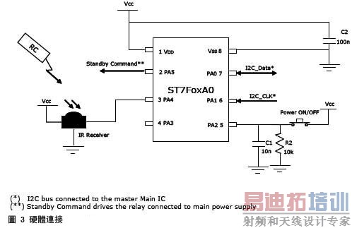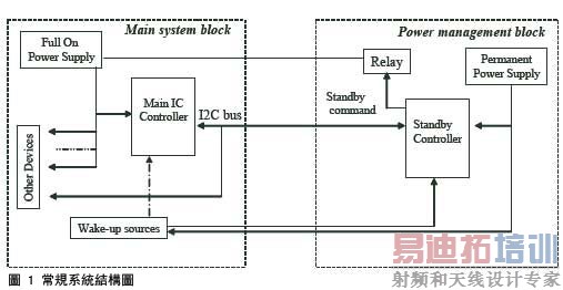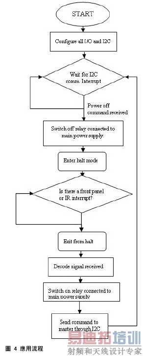 一旦系统被插上电源,系统所有部件都通电,并且处于执行状态。主IC 控制器将管理每个功能;它检测来自唤醒源(如远程控制器)和前面板的使用者输入;它利用I2C总线与其它设备和低功率微控制器相连接,在这种情况下,主IC 控制器被配置为主系统,而其它设备,包括低功率微控制器,则被配置成从属(slave)系统。