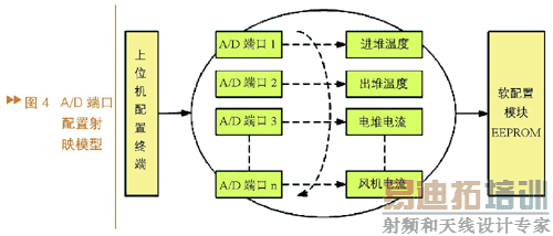 在控制器端口的配置升级过程中,上位机配置终端和控制器软配置模块对各个硬件端口的协同定义构成了一个映射模型(如图4)。所谓的映射模型可以抽象成这样的一个函数映射,即f:x→y,其中x和y是两个构件集合,在这里可以表示为控制器硬件端口序号及其实际应用功能, f是x到y的一个映射,是可变的,该映射关系通过EEPROM为媒介得以表现并保存。上位机每发送一次新的端口配置, f就改变一次,新的硬件端口功能也相应改变。例如,原来的控制器第一路A/D接口初始设置为"采集进堆温度信号",第二路A/D设置为"采集出堆温度信号","第一路"和"第二路"就是映射模型中的x,表示这是在控制器上的硬件端口序号;而"进堆温度"和"出堆温度"则是上位机所要配置的 y,表示端口的实际应用功能;而f则把两者关联起来,表示了x到y的映射关系。当上位机将这两路A/D接口交换配置时,f也相应发生变化,配置的结果就是"第一路"A/D端口变成"采集出堆温度信号","第二路"A/D端口则变成"采集进堆温度信号"了。