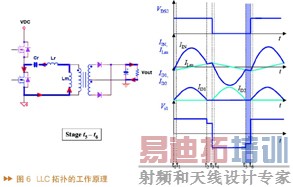 图6所示为LLC拓扑的工作原理。可以看到左边为两个MOS(高压MOS和低压MOS)串联两个电感,一个电容和一个变压器。二次侧部分有两个整流二极管,为非同步整流方式。图的右侧为电流与电压变化分段示意图。在T0-T1阶段,两个MOS没有导通,电流通过MOS的二极管逆流回去;在T1-T2阶段,高压侧MOS导通,电流从VDC流到地,在二次侧部分的二极管导通;T2-T3唯一改变的是二次侧的二极管关断,电流从Vout流出,两边为隔离状态,高压侧MOS还是导通,低压侧MOS还是关闭的;T3-T4阶段高压MOS关掉,低压MOS没有导通,但是电流通过低压侧MOS的二极管,二次侧的二极管也导通;T4-T5阶段低压MOS完全导通,二次侧的二极管也完全导通;T5-T6阶段二次侧二极管关断,低压MOS导通。