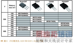 Vishay目前主推的LCD TV高压MOS为Gen6,是一种比较新的技术,以6"晶圆制造,其中包括K-Series与L-Series,可以从器件命名的最后一个字母看到。K-Series比较适用于PFC AC/DC SMPS以及电机驱动,或者硬开关全桥的初级开关、半桥、正向式转换器等。L-Series很适合AC/DC SMPS ZVS全桥中的初级开关。图7和图8列出了1M的电压产品。