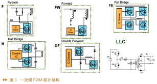 PFC即Power Factor Correction,是一个升压式架构。当PFC控制器的电源大于70W小于200W时,通常会采用DCM结构,这种结构电压比较高,通常需要选择600或650V的MOS。当电源大于200W时,通常采用CCM结构。对于一次侧PWM拓扑架构,如图3所示,一般采用的是Flyback架构。电源为65W或90W以下的适配器会采用Flyback架构,26"和32"电视也可能采用Flyback架构。半桥结构需要两个MOS,而全桥结构需要4个MOS。其实半桥和全桥式架构比较适用于大电源中。目前广为接受的TV电源主要是LLC架构,是由两个MOS Q1和Q2串联Cr、Lr和Lm,以及一个变压器组成,如图3中右下图所示。还有一些情况采用Forward和Double Forward构架,由于Forward电压非常大,可能达到900-1000V,因此电压选择要谨慎。而对于Double Forward而言,500V电压足矣。