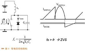 由于共振切换方式中电压电流交叉面积变小,相对开关损耗变小,效率变高,温度降低,因此通常采用共振切换的方式,目前最常用的是零电压切换。由于采用LC架构,其共振频率为 f_{r}=frac{1}{2πsqrt{L_{r}C_{r}}},当操作频率大于共振频率时,则操作在ZVS(零电压切换)架构上。从图4中可以看到,当电流增加时电压为零,电压增加时电流为零。只有在电流减小电压增加的瞬间才有小小的切换损耗,而大部分时间无损耗,相对于共振损耗来讲,这种情况损耗更小,因此ZVS架构效率更好。