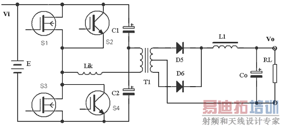 这种技术因通态损耗很低而使得DC/DC变换器的效率很高。但需工作频率相对较低,一般选取20~40kHz。由于半桥组合开关只需两个开关,总的开关器件的数目少,使可靠性显著提高。