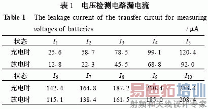 在实际使用过程中,为了保证10倍电压衰减的精度,电阻R采用33kΩ (1%精度) 。因为高精度的大电阻需要专门订做,而且贵。在实验中电池组的性能出现了明显的衰退,如图2所示。在前52次循环(0.5C充放电) 中,电池组中,单体电池的放电截止电压出现了很大的差异,随着循环的进行,按次序"排队"的现象比较明显,而且在第30次循环左右,电池组还没有放电到30V时,第1只电池的电压就已经处于过放电保护状态,从而导致了电池组的放电终止,电池组容量突然减少。为了验证是检测线上的漏电流所导致的,52次循环后,把电池组中的第1只和第10只电池进行交换后,继续进行循环实验,结果发现:第10只电池的放电终止电压稍有下降,而第1只的放电终止电压有了很大的提高;由于原来的第1只电池不再处于过放电保护状态,而使第2只电池处于过放电保护状态。以上实验说明:在电压检测电路中有一定的漏电流存在,对此进行了测量,结果如表1。