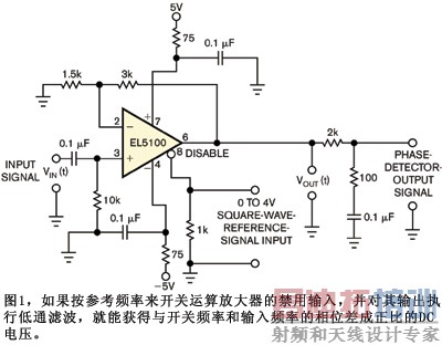 在该电路中,运算放大器的输出为:VOUT(t)=VIN(t)×G(t),其中VIN(t)=A cos(wREFt+q),G(t)为运算放大器的时变增益。G(t)是50%占空比的方波,它以相位参考信号的频率从0切换至G0。G0是运算放大器被启用时的增益。由于G(t)是时变周期函数,因此把它扩展成傅里叶级数:G(t)=G0[1/2+2/p{cos(wREFt)-1 /3cos(3wREFt)+1/5cos(5wREFt)+…}]。把VIN(t)乘以G(t),并只保留DC项,则输出的DC分量为 VOUT(dc)=(AG0/p)cos(q)。图1中的EL5100运算放大器具有200MHz单位增益带宽,并且如果把至少为0V~4V的方波施加到输出禁用端子(引脚8),就能通/断该放大器的输出。利用所示的反馈电阻,并且G0=3,检相器的峰值输出电压约等于输入信号的峰值。EL5100的禁用时间为180ns,启用时间为650ns,这使人们能按大约250kHz频率开关该器件的增益。在更高频率时,检相器的增益下降,这是因为增益开关不再具有50%占空比。