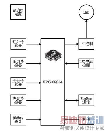 | 无线通信网络结构图 系统结构 智能节能路灯使用了功能强大的MC9S08QE64单片机作为控制器,利用单片机自身集成的中断、ADC、PWM等功能模块,实现了环境信号检测、LED控制、ZigBee通信等多种功能。Zigbee部分使用了MC13202作为控制芯片,使用SPI接口和单片机连接。 LED驱动部分利用MC9S08单片机带有的增强的TPM模块来产生PWM信号,驱动多路白光LED进行照明(使用多路LED是为了保证照明的亮度)。通过调节PWM信号的占空比,就可以调整LED的亮度。同时对LED的电流和照明光强进行检测,并反馈到PWM控制中,这样可以保证照明的亮度。 为了可靠的检测到人或者车辆的经过,我们使用了红外、压力、振动、声音等多种传感器来感知人体和车辆的运动,并综合进行判断,这样可以有效的检测到人和车辆的经过,同时减少了干扰信号对系统的影响。图一显示了整个系统的结构。
