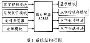 基于AT89S52 LED汉字显示屏系统组成如图1所示。主要由AT89S52构成微控制器,8块74LS373组成汉字代码的行锁存器,74LS154构成汉字的列选通,16块8×8点阵管LED2088BX构成四汉字显示屏,四个按键用于选择汉字显示方式,16个8550组成汉字列驱动。此外,系统还包括时钟振荡器、电源模块和系统复位模块。