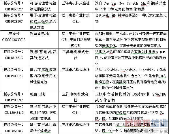 在电池配料时,通过机械混合法添加周期表中ⅡA、ⅢB、ⅣB、ⅦB、ⅧB、ⅡB主族元素和3、4、5周期的元素、氧化物或氢氧化物,能较好地提高或改善镍氢高温性能。世界著名电池制造公司在华申请授权的专利中多有介绍,如日本松下、三洋;中国比亚迪;德国H.C.施塔克等公司。详细见下表:
