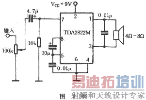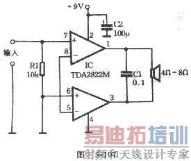 一般的集成功放电路外围元件较多且需要较大的散热器。本文介绍的功放电路简单,自 制方便。电路如图5-107所示。用一块TDA2822M功放集成电路接成BTL方式,外围元件只有一只电阻和两只电容,不用装散热器,放音效果也令人满意的。