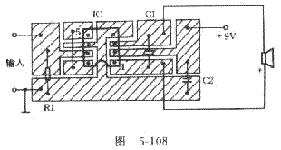 集成电路TDA2822M为8脚双列直插式封装,如果买不到可用TDA2822代替,TDA2822的封装与TDA2822M相同,它们区别在于: TDA2822M从3V到15V均可工作,而TDA2822的最高工作电压只有8V。使用TDA2822必须把电压降到8V以下。R1的数值要求不拘,一般选用10k的碳膜电阻。C1可选用0.1uF的涤纶电容,C2为100uF/160V的电解电容。图5-108是其印制电路板图。由于电路简单,印制板可用铲刻法制作用水磨砂纸或牛皮纸沾少量水擦亮,用水洗净擦干,涂上一层松香酒精溶液,干后把元件直接焊在铜箔面即可。焊好后检查无误,然后先不接扬声器,接上电源,则正负输出端之间电压应小于0.1V。接上扬声器,用手触摸输入端,扬声器应发出较大的"嗡"声。这时即可输入信号试音。电路板不用钻孔,