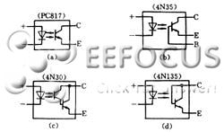 光耦合器有双列直插式、管式、光导纤维式等多种封装形式,其种类达数十种。光耦合器的分类及内部电路如图1所示。图中是8种典型产品的型号:(a)通用型(无基极引线);(b)通用型(有基极引线);(c)达林顿型;(d)高速型;(e)光集成电路;(f)光纤型;(g)光敏晶闸管型;(h)光敏场效应管型。
