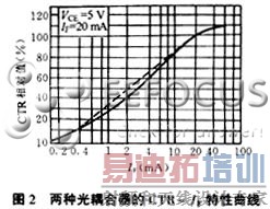 采用一只光敏三极管的光耦合器,CTR的范围大多为20%~300%(如4N35),而PC817则为80%~160%,达林顿型光耦合器(如4N30)可达100%~5000%。这表明欲获得同样的输出电流,后者只需较小的输入电流。因此,CTR参数与晶体管的hFE有某种相似之处。线性光耦合器与普通光耦合器典型的CTR-IF特性曲线,分别如图2中的虚线和实线所示。