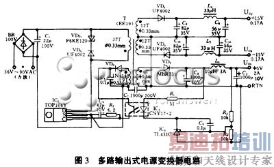 多路输出式电源变换器电路如图3所示。其输入电压为36V到90V的准方波电压,三路输出分别为:UO1=+5V(2A),UO2=+15V(0.17A),UO3=-15V(0.17A)。现将UO1定为主输出,其电压调整率SV=±0.4%;UO2和UO3为辅输出,总电源效率可达75%~80%。电路中采用一片TOP104Y型三端单片开关电源集成电路。主输出绕组电压经过VD2、C2、L1和C3整流滤波后,得到+5V电压。VD2采用MBR735型35V/7.5A肖特基二极管。两个辅输出绕组及输出电路完全呈对称结构。因为±15V输出电流较小,故整流管VD4和VD5均采用UF4002型100V/1A的超快恢复二极管。由线性光耦CNY17-2和可调式精密并联稳压器TL431C构成光耦反馈式精密开关电源,可以对+5V电压进行精密调整。反馈绕组电压通过VD3、C4整流滤波后,得到12V反馈电压。由P6KE120型瞬态电压抑制器和UF4002型超快恢复二极管构成的漏极钳位保护电路,能吸收由高频变压器漏感形成的尖峰电压,保护芯片内部的功率场效应管MOSFET不受损坏。