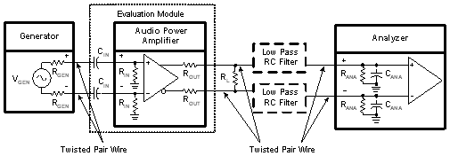 测试D类放大器的性能并不困难,但常常要求低通滤波器,因为许多分析仪输出都不能准确地处理快速改变的PWM输出。图四显示了如何将频率发生器连接至D类APA,以及如何在APA与分析仪之间连接低通RC过滤器。