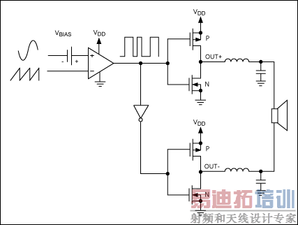 Maxim的D类放大器调制方案采用了一个内部生成的锯齿波,并在输入部分采用一个互补信号对。如果没有互补输入信号,则会在IC内部产生一个差分输入。