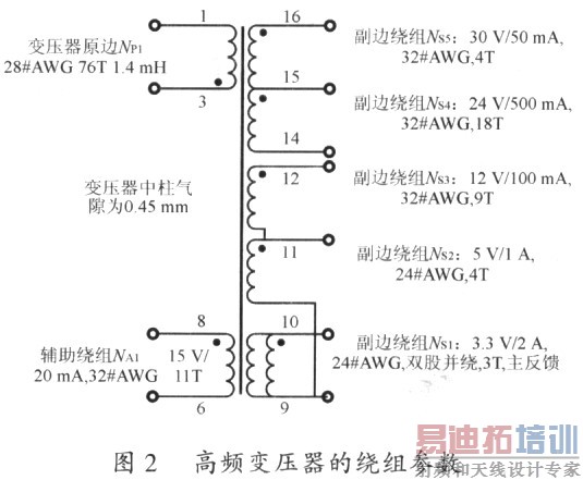 利用反激式开关电源的高频变压器一般设计方法或专用的VIPERSCOFT软件设计机顶盒的高频变压器。辅助绕组用来提供15V工作电压,由于与脚VDD相连的误差放大器设定值为15V,因此副边绕组的匝数必须通过副边绕组与辅助绕组匝数比来建立。首先选定原级与电压输出最低的次级的匝比,Np/NoL,然后计算每匝电压值V1,V1=(VOL十VD)/NoL,VD为二极管正向导通压降,PN结二极管取0.7V,肖特基二极管取0.4V。最终确立了一组高频变压器参数,如图2所示。