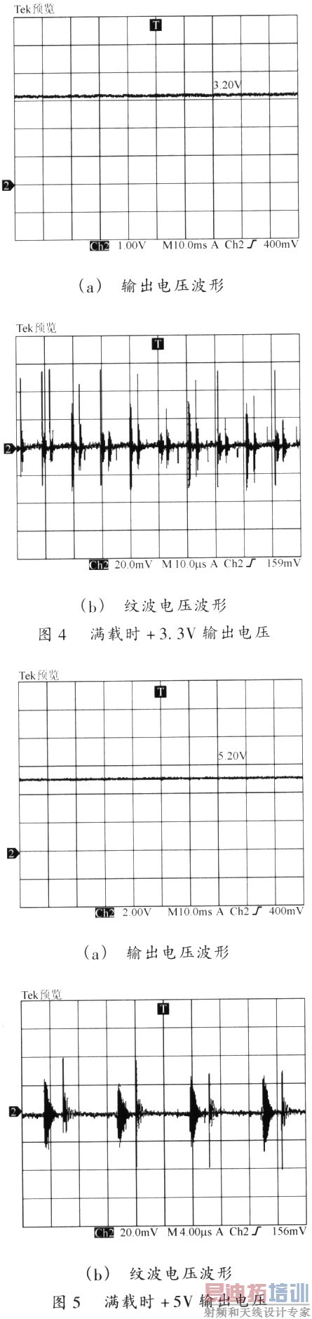 在实验室完成了对该机顶盒开关电源的制作和实验,电路板尺寸为74mm×186mm。实测最小输入交流电压85V时的最大占空比为45%,额定输入交流电压220V时最大占空比为28%。电源输入端连续传导骚扰的准峰值和平均值曲线均符合EN55022CLASSB标准。交流220V供电时,轻载与满载时辅助绕组提供的工作电源均为15V,最大工作电流20mA。轻载时+3.3V、+5V、+12V、+24V和+30V输出平均值分别为3.48V、5.52V、14.0V、25.0V和30.8V,最大纹波电压峰峰值小于20mV。满载时分别输出3.20V、5.20V、12.1V、23.1V和30.0V,最大纹波电压峰峰值分别为175mV、150mV、250mV、80mV和80mV。满载时+3.3V、+5V和+24V输出的输出电压波形和对应的纹波电压波形分别如陶4、图5和图6所示.功率M0SFET的集电极D与发射极S之间的电压VCE如图7所示,可见占空比为28%,小于50%,VCE峰值为540V,另外空载时VCE峰值为450V,均小于MOSFET的击穿电压620V。