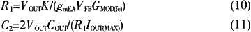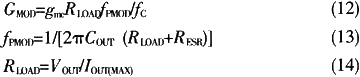 式中,K为高频时回路的修正参数,其值与输出电容有关,一般在10μF时取0.55,22μF时取0.47。VFB为参考电压(一般取0.8 V)。gmEA取定值60μs。Gmc定值取4.2 s。GMOD为DC调制增益,RLOAD为输出负载,上式中未知变量的计算式如下: