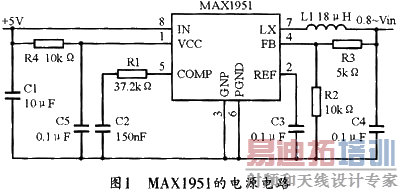 MAX1951是MAXIM公司的一款高效的DC-DC电源转换芯片,主要用于DSP、FPGA、ASIC的内核及I/O口供电。其高达94%的转换效率、8脚的SOP表贴封装及连续工作时956 mW的低功耗使其特别适合于便捷式电子设备的应用。MAX1951的输入电压范围为2.6~5.5 V,输出电压范围为0.8 V~Vin(可调输出),输出电流可达2 A,精度可达1%,开关频率为1 MHz,输出效率达94%,且内含过载及过热保护电路。