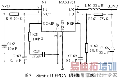 Stratix II FPGA的I/O与PD的供电要求不怎么严格,所以可接成共电3.3VD,经估算,其最大工作电流为0.1A。因此,按照本文所提供的关系式可以很容易地得出其输入输出滤波网络的参数,图3所示是用MAX1951设计的Stratix II FPGA系统的I/O口供电电路。