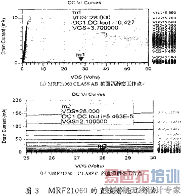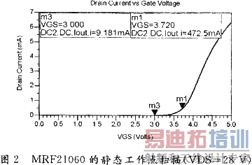 对LDMOS管子的MRF21060进行静态工作点扫描,选定合适的静态工作点,如图2所示。