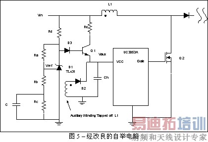 在某些电源中,PWM 由类似图4所示电路的辅助绕组供电。这种电路的问题在于,在轻负载工作情况下,辅助绕组中存储的能量不足以给 IC 供电。电源的工作情况甚至会变得难以估计,因为 PWM 将不断开关。图 6 所示的电路给出了解决这种问题的办法,即采用串联旁路稳压器,在轻负载条件下启动,而在偏置绕组可以为 PWM 控制器供电情况下关闭。