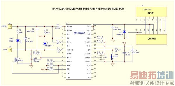 MAX5922A电路被配置为中跨PSE并用作单端、中跨馈电器。J1 RJ-45连接器输入接收来自以太网路由器/开关上的数据,并直接将数据发送到输出。电路将48V电压注入J1 RJ-45连接器输出的空闲线对(引脚4、5、7和8)。对于终端PSE应用,将DCA引脚连接到DGND,利用PoE变压器输出电功率到信号线对上。