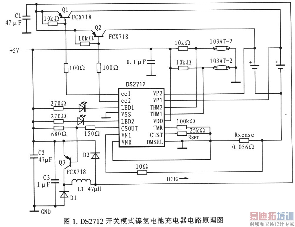 图1所示为开关模式充电器。它采用DS2712调节充电电流和终止充电。控制器监视温度、电池电压和电池电流。两个热敏电阻输入THMl和THM2分别监视每节电池的温度。电压检测输入端VPl和VP2分别用于检测2节并联电池的端电压。快充时间通过TMR与地之间的电阻设置,时间范围在0.5h至10h之间。浮充时间是快充时间的一半。
