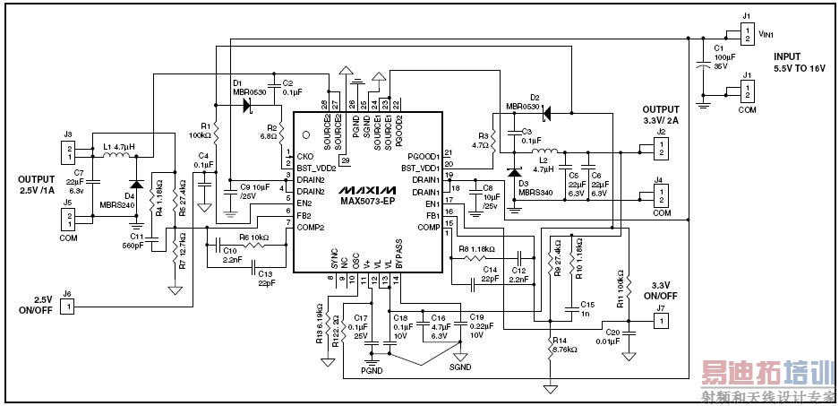 MAX5073双通道降压转换器工作于2MHz开关频率的参考设计